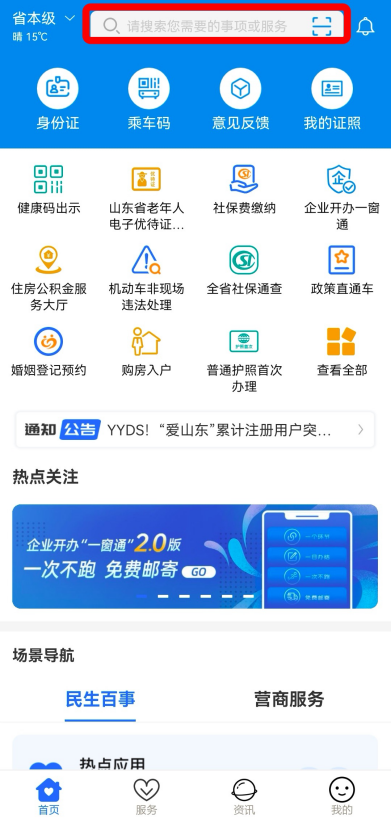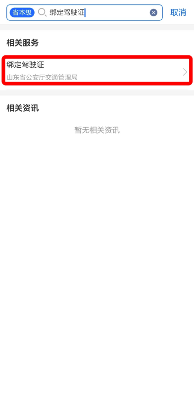 经常有出行需求的你总会有这样的烦恼:出门后发现忘记带行驶证,迫不得已折返回家;驾驶证马上到期,不知该如何换证;违章却不知情,甚至多次“踩坑”,线下处理又总是没时间…… 别犯难!“爱山东”APP已上线15类交管服务,保准给你安排得明明白白。滴滴……快上车! 绑定驾驶证和机动车,随查随看证件状态;随时查询违章信息,在线处理超方便;还支持补换领车牌、补领合格标志、线上申请换证与补证、延期审验……在山东,交管服务用“爱山东”就够了! 方式一:打开“爱山东”APP,在首页搜索栏输入并搜索要办理的交管服务,如“绑定驾驶证”。
