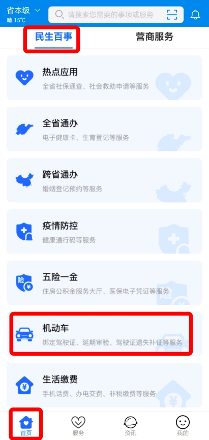 方式二:打开“爱山东”APP,在首页【民生百事】栏目中找到【机动车】专区,点击进入后,选择要办理的服务。