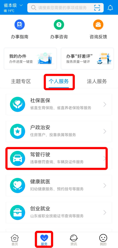 方式三:打开“爱山东”APP,在服务【个人服务】栏目中找到【驾管行驶】专区,点击进入后,选择要办理的服务。