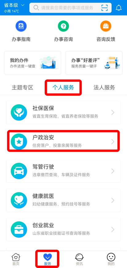 1.打开“爱山东”APP,在服务里【个人服务】栏目中找到【户政治安】专区。