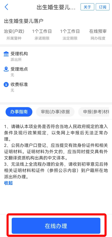 3.查看相关信息后点击“在线办理”,按照要求填写申报信息,并上传附件。