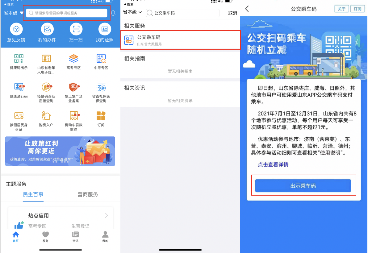 怎么使用“爱山东乘车码”? 1. 打开“爱山东”APP,首页搜索“公交乘车码”。 2. 点击进入“公交乘车码”服务。 3. 阅读相关须知后,点击“出示乘车码”即可乘坐公交车(注:首次使用乘车码用户,需绑定62开头的银行卡) (活动细则详见活动页面)