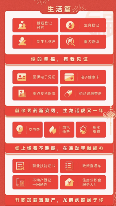 3. 生活篇 你的幸福,有我见证。大手牵小手,人生的每一件大事都有“爱山东”,婚姻登记预约、生育登记、新生儿落户、重名查询,婚育户事+孩子起名统统交给“爱山东”! 就诊买药新姿势,生龙活虎又一年。“爱山东”祝每一位朋友身体倍儿棒,吃嘛嘛香。如需就诊,医保电子凭证、电子健康卡、重点专科医院和药品追溯查询可以帮忙。 线上缴费不跑腿,在家动手就能办。没电费了?没燃气费了?没水费了?线下缴费太麻烦,“爱山东”的线上缴费so easy,搜索交电费、燃气缴费、用水缴费,轻松搞定! 升职加薪置新产,龙腾虎跃属于你。新年新气象,祝各位朋友事业蒸蒸日上,步步高升。职业技能证书、政策直通车、不动产登记一网通办和住房公积金服务大厅陪你“打怪升级”。