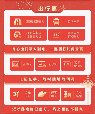 2. 出行篇 开心出门平安到家,一路畅行如虎添翼。“爱山东”整合高速路况查询、买汽车票、机动车非现场违法处理、高速公路ETC查询等常用功能,方便出行的你。 E证在手,随时随地随便亮。出门在外,没带实体卡怎么办?别着急,有“爱山东”的电子证照来帮忙,身份证、行驶证、老年优待证等334类证照一键即亮。 近郊游攻略已备好,线上预约不排队。过年去哪儿玩?文旅专区欢迎您!文化场馆、热门景点、正在展览、旅游路线、非物质文化遗产等应有尽有,网上购票更方便。