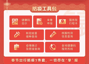 一元复始,万象更新,“爱山东”陪您走过牛气冲天的牛年,迎来虎虎生威的虎年,不论今年的你是就地过年,还是回家团圆,“爱山东”都与你同在、伴你同行,祝你虎年大吉!“爱山东”倾情为7000多万注册用户准备了新春大礼——【春节专区】,快来get吧! 1. 防疫工具包 春节出行防疫7件套,一切尽在“掌”握。 “爱山东”的【防疫工具包】内含健康码出示、来鲁申报、国务院行程卡、新冠疫苗接种查询、核酸检测信息查询、疫情确诊及密接查询和各地健康码服务热线。