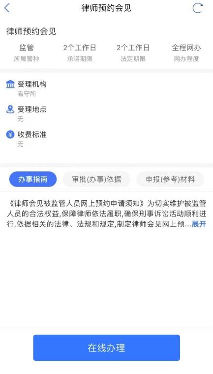 全部服务 该模块包含户籍业务、交通出行、出入境、监管/其他共四大类公安政务服务,涉及律师预约会见、户口学籍迁移、护照相关事宜办理等四十余项具体服务,致力于为群众提供覆盖面广、使用频率高的在线公安服务,方便群众在线办事。 具体怎么操作?以“律师预约会见”为例,点击“监管/其他—律师预约会见”,阅读办事指南,点击底部“在线办理”;填写申报人信息、会见申请信息、被会见人信息,并上传附件,点击“提交”即可。