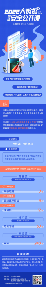 本次培训奖项设置宣传推广奖、竞赛奖、幸运奖。 (一)宣传推广奖:宣传推广奖设置63名,奖品为电动牙刷。根据用户邀请新用户参与培训活动的人数进行排名,邀请人数越多,排名越高。若邀请人数相同,以邀请时间先后顺序进行排名,第二天统计前一天邀请人数数量,前三名可获得宣传推广奖,每日公示前一天获得宣传推广奖名单。宣传推广奖不能重复中奖。 (二)竞赛奖:竞赛奖设置21名。一等奖3名,二等奖6名,三等奖12名。一等奖为平板电脑,二等奖为无线蓝牙耳机,三等奖为吹风机。竞赛期间,每周抽奖一次,共抽奖3次,抽奖时间分别为9月12日、9月19日、9月26日。每次从获得100分者中抽1名一等奖,从获得90分及以上者中抽2名二等奖,从获得80分及以上者中抽4名三等奖,竞赛奖不能重复中奖。 (三)看视频抽幸运奖:共设置240名幸运奖,奖品为手环。总共20个视频,观看视频抽奖时间与竞赛答题抽奖时间一致,分3次由爱山东后台进行抽奖。9月12日、9月19日、9月26日进行三次抽奖,每次抽奖时,统计看满7个视频的用户,可获得一次抽奖机会,统计看满14个视频的用户,可获得两次抽奖机会,统计看满20个视频的用户,可获得三次抽奖机会,幸运奖不能重复中奖。每次抽奖结束,获奖名单与竞赛答题获奖名单一起公示。 网络安全为人民,网络安全靠人民。强化网络安全意识,营造清朗网络空间,维护社会信息安全与我们每个人息息相关。9月5日-9月25日,登录“爱山东”APP,邀请好友共同参加“2022大数据网络安全公开课”,学习网络安全知识,赢取幸运大奖!