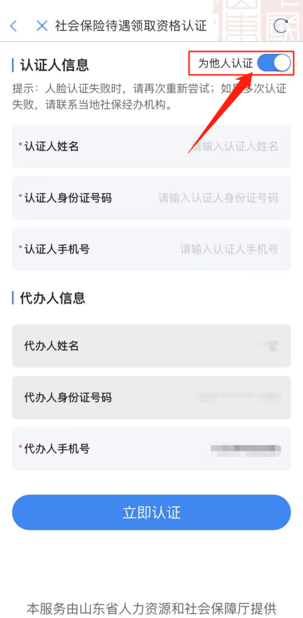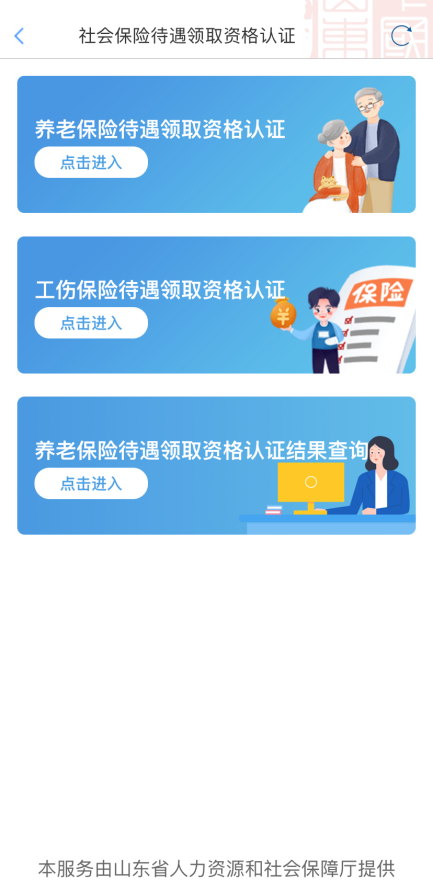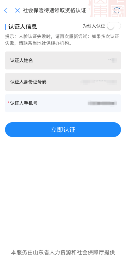 养老资格认证 为确保退休金按时发放,退休人员需要每年至少进行一次养老待遇资格认证。现在打开“爱山东”,父母足不出户动动手、眨眨眼,就能省心办事、轻松认证。 操作步骤: 1、进入“养老资格认证”服务,选择“养老保险待遇领取资格认证”,点击“立即认证”,根据提示人脸识别即可; 2、子女还可以使用自己的账号协助父母认证,点击右上角“为他人认证”,输入认证人信息,人脸识别即可完成; 3、认证完成后,进入“养老保险待遇领取资格认证结果查询”查看认证结果。