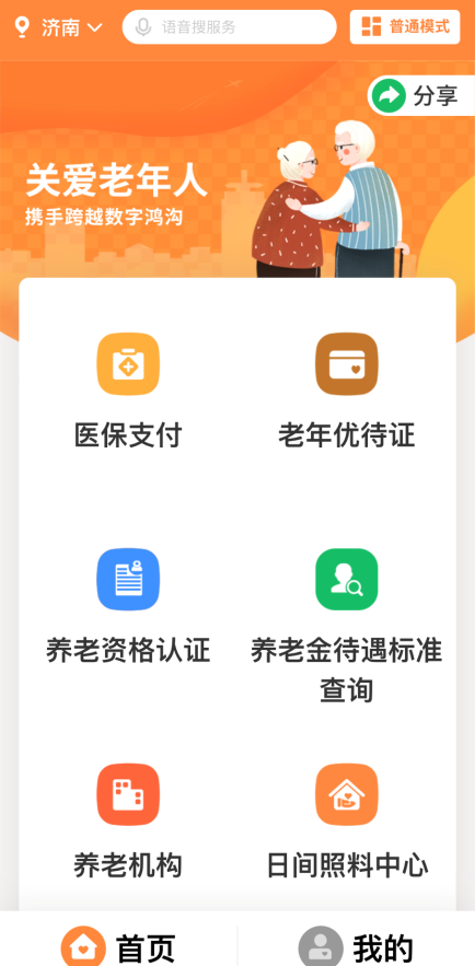 快节奏的数字时代 不断更新迭代的新技术 让我们的脚步越走越快 对于父母来说 却是一道难以逾越的“数字鸿沟”: 那些我们点点手机就办好的事 父母仍然习惯往返窗口办理 现在打开手机就能出示的电子证照 他们还一直随身携带着实体证件 …… 如何让父母长辈也能享受到大数据带来的“数字红利”?“爱山东”积极推进平台适老化改造,为老年朋友留出一条“慢行道”,推出老年关怀模式、养老待遇资格认证、老年电子优待证等服务。 重阳佳节,请把下面这份服务指南分享给父母,带他们体验“爱山东”掌上服务的便利。 老年关怀模式 老年关怀模式整合医保支付、老年优待证、养老资格认证等与老年朋友密切相关的服务,进行字号图标放大、页面极简等适老化设计,让服务更醒目、栏目更清晰、操作更便捷。 进入“爱山东”APP、支付宝、微信小程序,点击顶部的“老年人服务”即可一键切换。