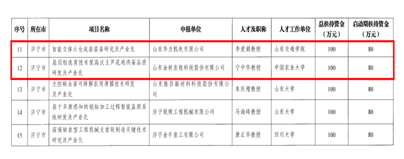 近日,市发改委下达了《关于分解下达我市2023年度省重点扶持区域引进急需紧缺人才项目计划的通知》,我县山东华力机电有限公司智能立体云仓成套装备研究及产业化项目和山东金秋农牧科技股份有限公司基因组选育技术提高汶上芦花鸡肉蛋品质研发及产业化项目成功申报2023年度省重点扶持区域引进急需紧缺人才项目,分别获得资助经费100万元,共计200万元,项目个数居全市第一。