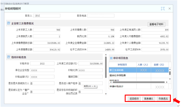 (八)核实补贴明细信息,如无误点击“信息确认”,如果核对不正确,点击“返回修改”或“作废退出”后重新申请