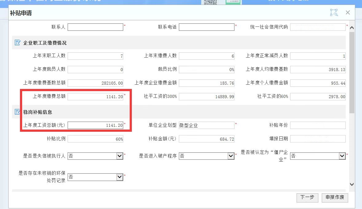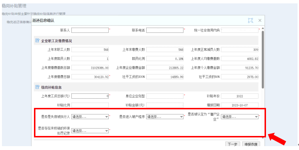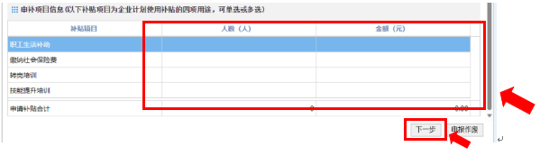 (七)稳岗返还资金主要用于职工生活补助、缴纳社会保险费、转岗培训、技能提升培训等四项稳定就业岗位相关支出,必须坚持专款专用,请按照实际情况填写对应项目的人数与金额,核实无误后点击“下一步”
