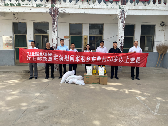 7月1日上午,县退役军人事务局党组成员、副局长郑汝本,县邮政局军屯乡支局局长郭克成,一行到军屯乡东曹村走访慰问60岁以上党员,为老党员们送去了米、面、油等生活用品,并向他们致以诚挚的问候和崇高的敬意。军屯乡党委副书记、下派工作队队长郭德鲁,副乡长高颖,驻村第一书记刘勇等工作人员陪同。