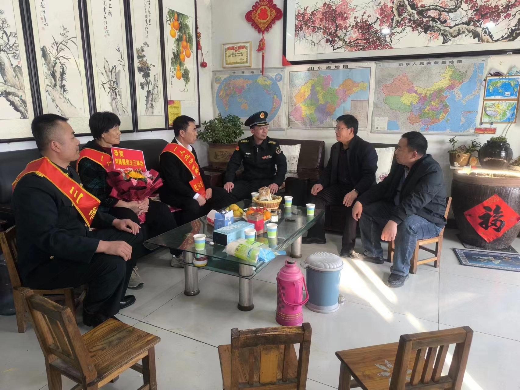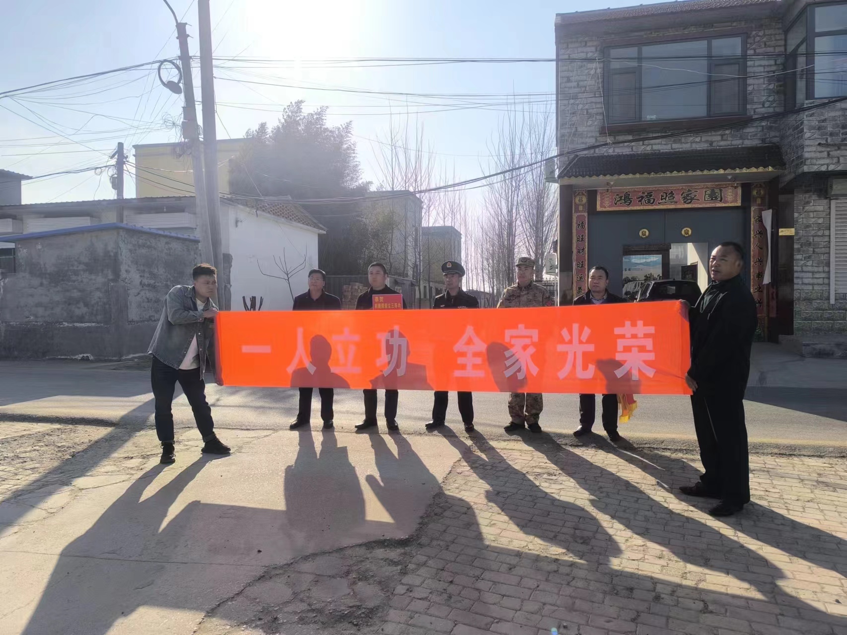 在现役军人刘腾腾家中村,领导们一同将立功喜报送到军属手中,与其亲切交谈,详细询问他们的生活和工作情况后,叮嘱军属有任何困难都可以与镇退役军人服务站联系。希望他们继续支持孩子投身国防军队建设,鼓励孩子在部队再接再厉、再立新功。
