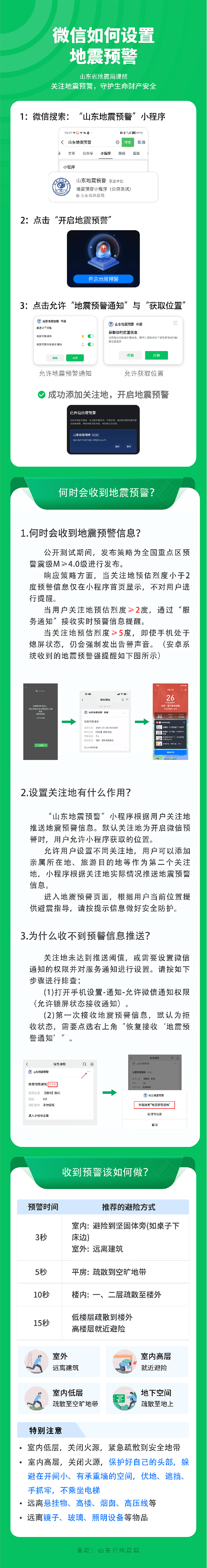在微信搜索“山东地震预警”小程序,点击“开启地震预警”,并允许“地震预警通知”与“获取位置”,成功添加关注地即可开启地震预警服务。具体设置步骤如下。