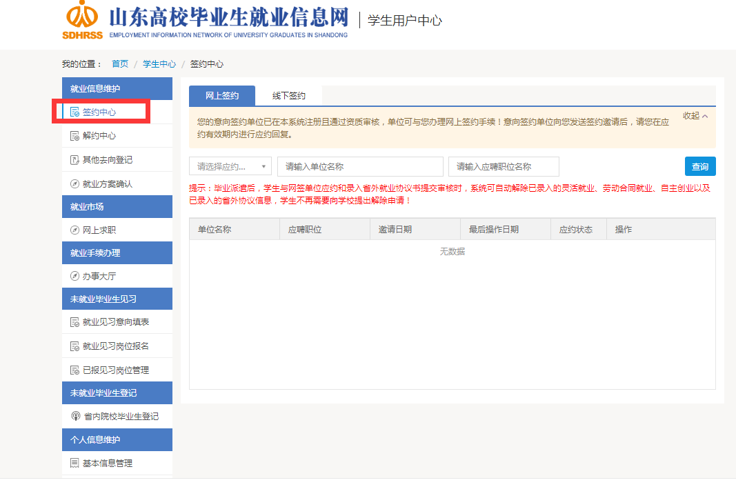 3、进入到学生用户中心后,在就业信息维护下面的“签约中心”与签约单位进行签约,完成网上签约。