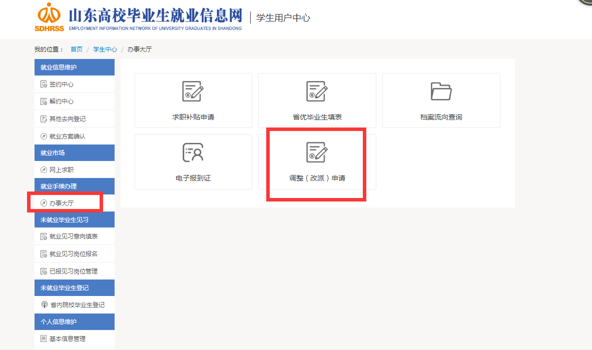 4、在就业手续办理的“办事大厅”下面选择“调整(改派)申请”,待人社部门审核通过后,学生可以通过“办事大厅”下的“电子报到证”栏目下载打印新的电子报到证。