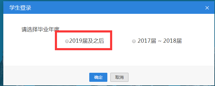 2、进入“学生登录”通道,选择相应的毕业年度“2019届及之后”,填写账号密码之后登录。