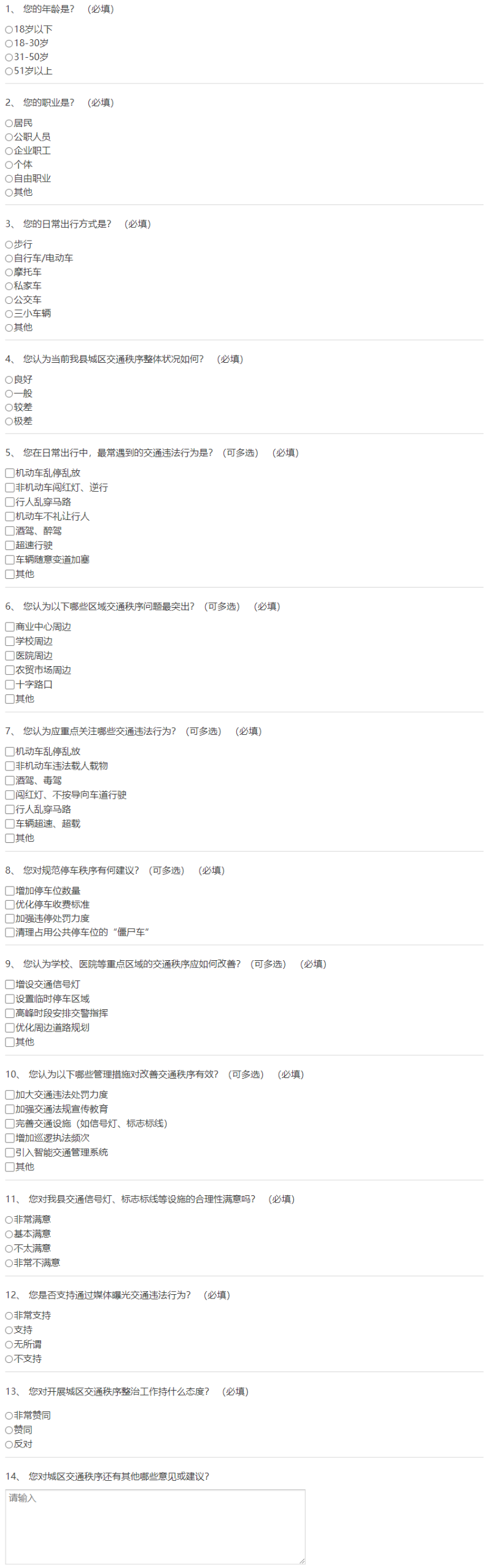 2025年8月13日——2025年8月23日汶上县发布的《城区交通秩序民意调查问卷》活动已经结束,非常感谢您对我们此次活动的支持!
