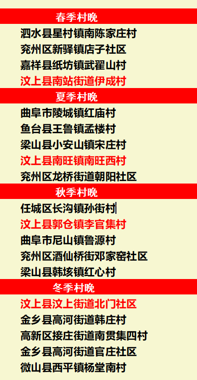 1月26日,济宁市文化和旅游局公布2026年全市“四季村晚”群众文化活动示范展示点名单,汶上县4个村(社区)成功入选,实现春、夏、秋、冬四季示范展示点全覆盖,以文化之力赋能乡村振兴发展。