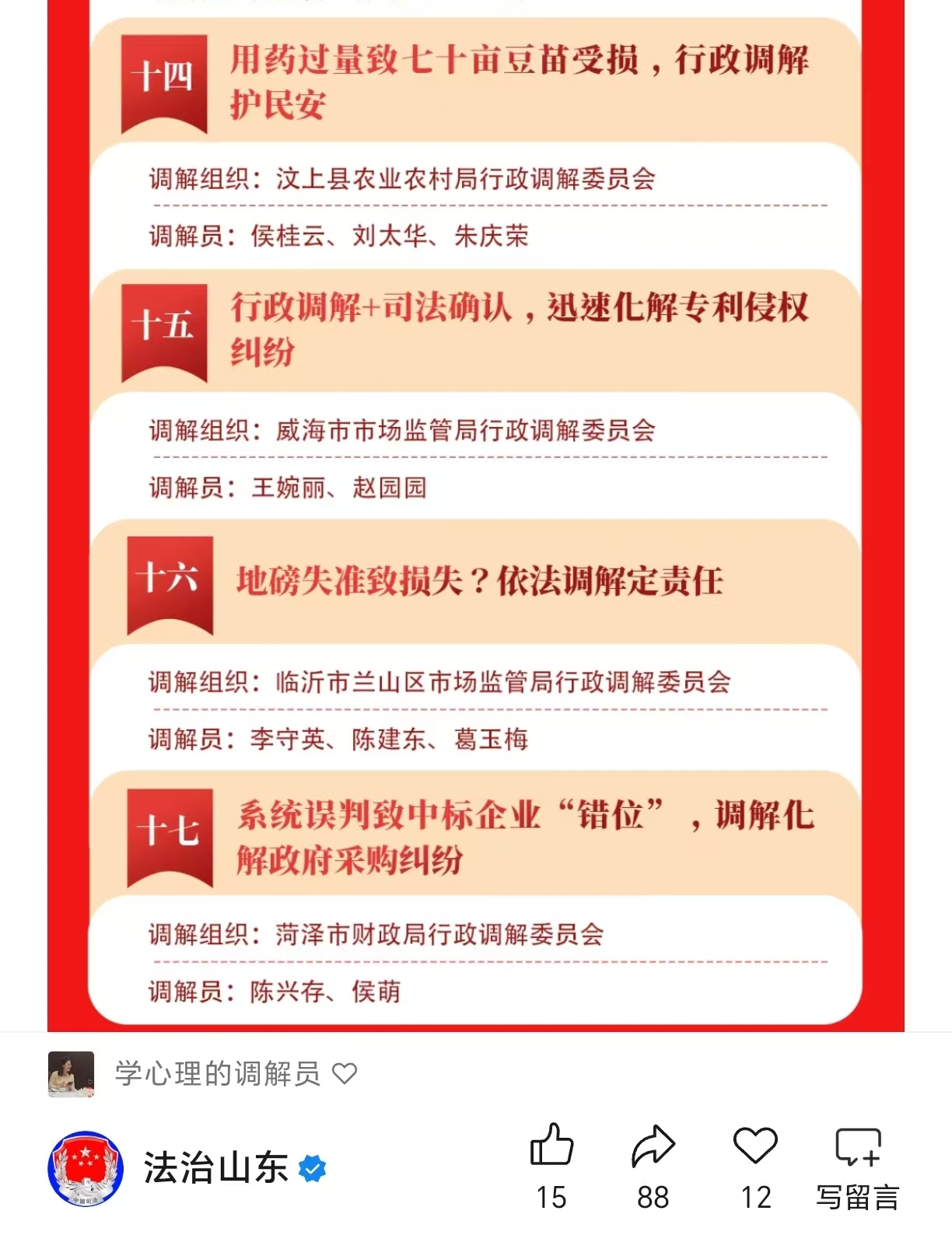 近日,由山东省司法厅、齐鲁晚报·齐鲁壹点联合开展的山东省第四届“十佳调解案例”征集展播活动结果揭晓。我局报送的“用药过量致七十亩豆苗受损,行政调解护民安”,经层层筛选与严格评审,成功入选山东省第四届“十佳调解案例”提名优秀案例。