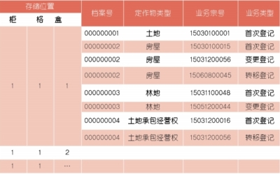图中可见,档案采用统一存储管理,如1柜1格1盒存放了4个档案,分别有土地、房屋、林地和承包经营权。 每个档案号内按业务链关系合并存放,例如房屋档案000000002包含该套房屋产权链上对应3手业务(首次登记、变更登记、转移登记)的档案资料,其他定作物的档案合并方式与房屋类似。也就是说永久性不动产权登记档案采用合档模式,即同一个不动产单元的不动产权登记链上的多手业务应存放在一个档案保管号中。 定期档案。抵押档案(抵押权预告档案视为抵押档案)为定期档案,采用8位数字(如00000123),不动产抵押业务的档案,包括土地抵押、房产抵押、林权抵押、在建建筑物抵押等。 不同类型的定期档案均采用合档模式进行归档。例如抵押设定登记产生新档案号后,该抵押的转移、变更、更正业务件均归入抵押设定业务件所在的档案号内。 短期档案。查封档案、异议档案、 地役权档案、 查询档案为短期,采用7位数字(如0000123)。查封档案,即预查封和查封登记的档案,包括土地查封、房产查封、林权查封等。异议档案,即异议登记的档案。地役权档案,即地役权登记的档案。查询登记档案,指查询登记的档案(由于资料少,一般没有归档)。此类档案,可按办理生成时间的顺序,一直使用大流水号,不倒号。 |