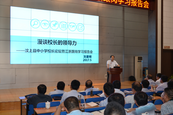 然后,县教师教育中心校长侯典军做题为《培训永远在路上》的专题报告,明确了教师培训面临的挑战和制约瓶颈,并深入阐述了教师培训的有效途径,指明了我县下一步教师培训工作的方向。 最后,县教体局副局长刘夏明以《漫谈校长的领导力》为题,从校长的归属感,校长的领导力以及校长领导力提升等方面展开,深入分析了校长工作面临的新形势、新要求,明确了新时期校长工作的全新定位,详细解读了校长工作中纷繁复杂的各类具体问题,为全县校长的自身发展指明了方向。强调了校长工作的使命是为了每一个学生的发展,勉励全体校长要加强自我修为,学习引领,实现由事务管理、制度管理到使命管理的境界提升,切实提升校长领导力。 此次全县中小学校长论坛暨江浙跟岗学习报告会是对2017年3月以来先后赴江苏海安、浙江湖州、浙江大学“跟岗式学习”培训地全面总结,是跟岗学习的102名中小学校长和教育干部对先进理念、先进经验地深层次分享,是一次思想的盛会、创新的盛会、丰收的盛会,必将对全县教育工作者的专业发展及全县中小学校的品质内涵发展起到巨大的推动作用。 论坛由县实验小学党支部书记、县名师名校长学术交流中心小学部主任刘景主持。论坛形式生动活波,创新性地安排了青年教师、校长的歌曲演唱及轻松愉快的手指操。