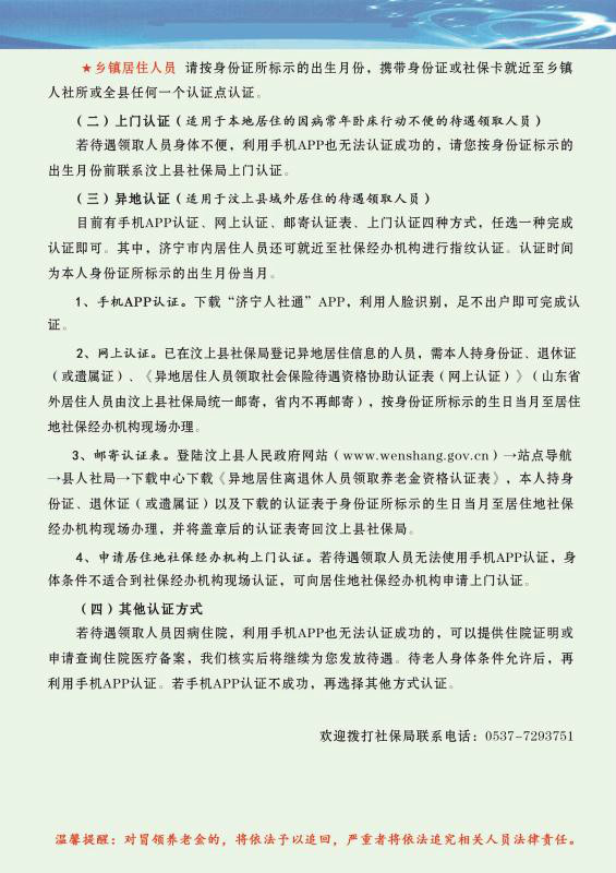 汶上县企业养老保险待遇领取资格认证方式
