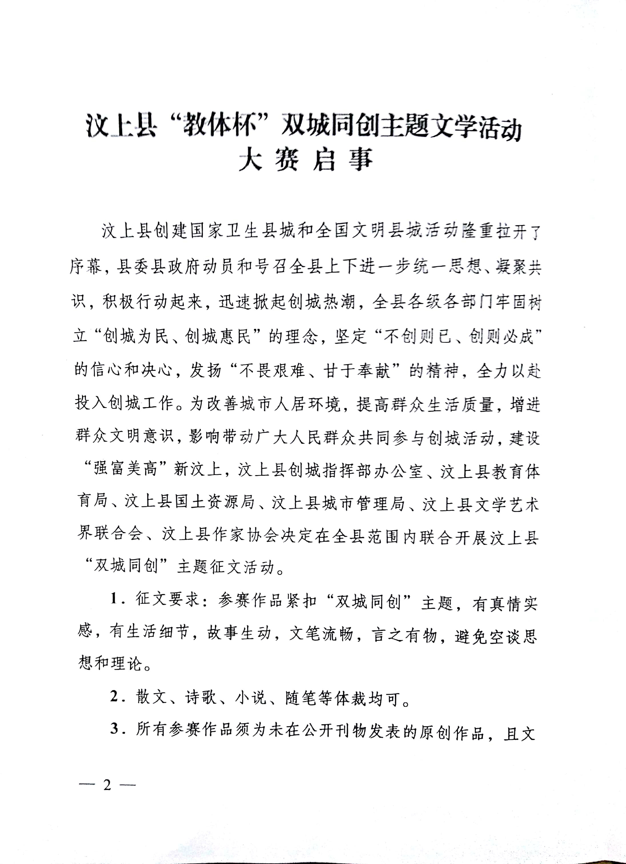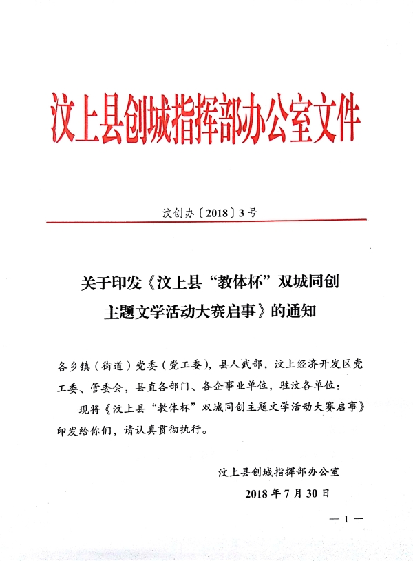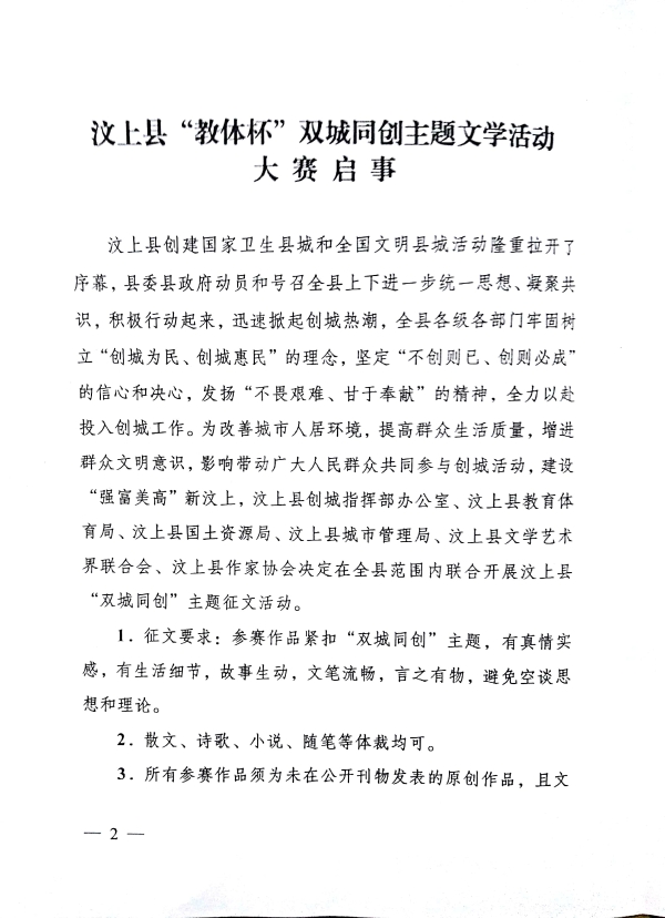汶上县创城办关于印发《汶上县“教体杯”双城同创主题文学活动大赛启事》的通知