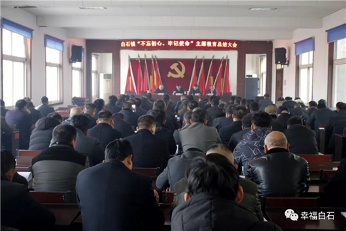 1月20日,白石镇召开“不忘初心、牢记使命”主题教育总结大会,贯彻落实中央和省市县“不忘初心、牢记使命”主题教育总结大会精神,对全镇主题教育开展情况进行回顾总结,对巩固和深化主题教育成果进行安排部署。县委第八巡回指导组副组长陈勇、成员续昌辉同志到会指导,镇党委副书记高井玉主持会议,党委书记汪林作重要讲话,镇科级领导干部,全体机关干部,各村支部书记、副书记、文书参加会议。