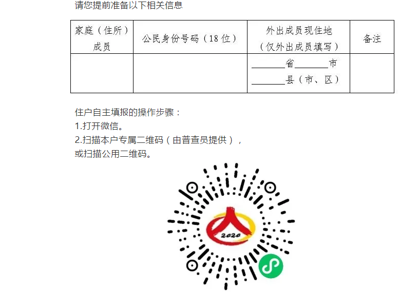 这次普查将采用普查员入户登记,或由住户您通过微信小程序自主填报的登记方式。普查标准时点是11月1日零时。10月11日至12月10日期间,普查员将佩戴县级以上人民政府普查机构统一颁发的证件入户开展工作。为节省登记时间,请您提前了解家(住所)中每一位成员的公民身份号码、受教育程度、外出成员的现住地址等基本信息,并在家中留一位熟悉情况的人向普查员申报,以保证普查登记的准确性。