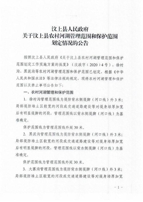 关于汶上县农村河湖管理范围和保护范围划定情况的公告