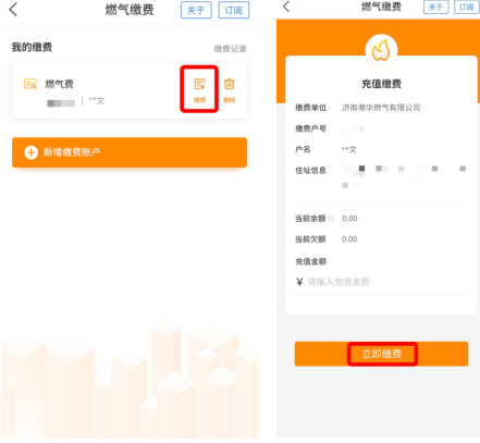 再次使用“爱山东”燃气缴费服务时,直接进入该应用首页,点击页面上方的“缴费”按钮,可立即进行缴费。