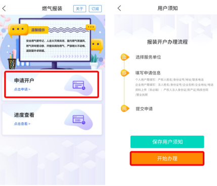 此外,“爱山东”还可以办理燃气报装业务,以个人户为例,操作步骤如下: 1.进入“燃气报装”服务,点击【申请开户】,阅读用户须知后,点击【开始办理】。
