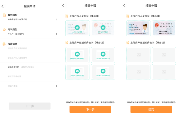 3.按要求填写报装信息,完成后点击【下一步】,上传相关图片(非必填)并提交。