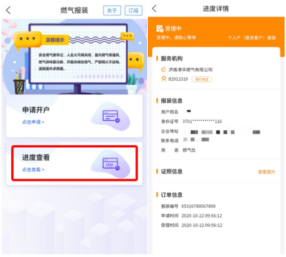 4.报装申请提交成功,可在燃气报装服务首页查看办理进度。