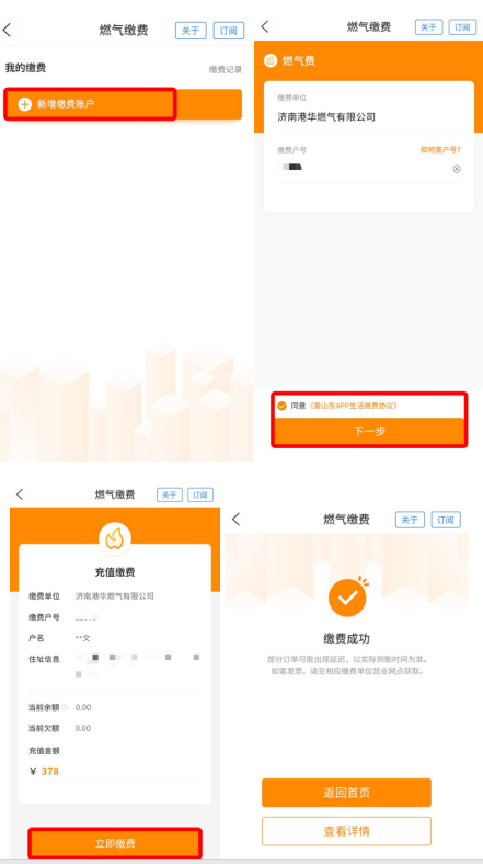 燃气开户去哪儿办?怎么线上缴纳燃气费?缴费账单怎么查?别着急,这个冬天“爱山东”移动政务服务平台“燃气缴费”和“燃气报装”应用统统帮你搞定! “燃气缴费”和“燃气报装”两项应用以快捷办事为导向,依托全省移动政务服务平台基础支撑能力,实现减材料、减填报、减环节、减跑动、减时间,以达到“零跑动”“指尖办”的效果。 具体怎么操作呢?我们一起来看看吧! 1.打开“爱山东”APP,进入燃气缴费服务,点击【新增缴费账户】。 2.选择所在的服务单位后,输入缴费户号,点击【下一步】。 3.在充值金额处,输入要充值的金额,点击【立即缴费】。 4.缴费成功。