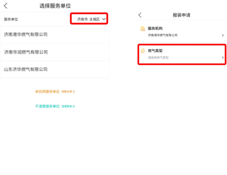 2.选择服务单位(右上角可选择所在地区),跳转到“报装申请”界面后,选择【用气类型】。