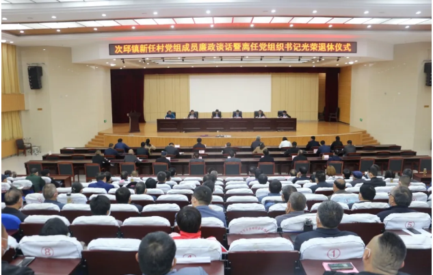4月14日,次邱镇举办新任村党组织成员廉政谈话暨离任村党组织书记荣退仪式,镇党委书记郭秋菊出席会议并讲话,镇党委副书记、镇长颜丙生主持会议,副科级以上领导、管区全体、各村新任村党组织委员和离任村党组织书记代表参加会议。