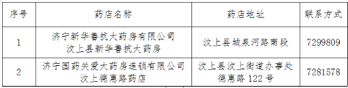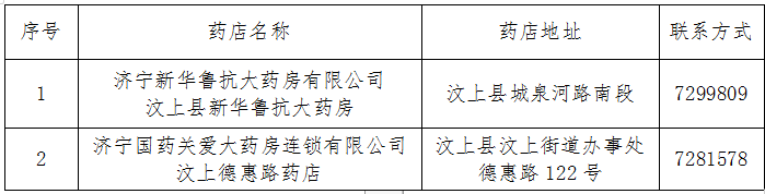 为确保谈判药品和医保特殊药品供应,更好地满足我县参保人群的基本医疗需求,根据《关于进一步做好国家谈判药品医保经办有关工作的通知》(鲁医保中心函(2020)15号),按照总量控制、合理布局、择优选择的原则,经市局复核批复,确定将济宁新华鲁抗大药房有限公司汶上县新华鲁抗大药房、济宁国药关爱大药房连锁有限公司汶上德惠路药店2家零售药店纳入济宁市基本医疗保险协议管理特药零售药店,现予以公布。