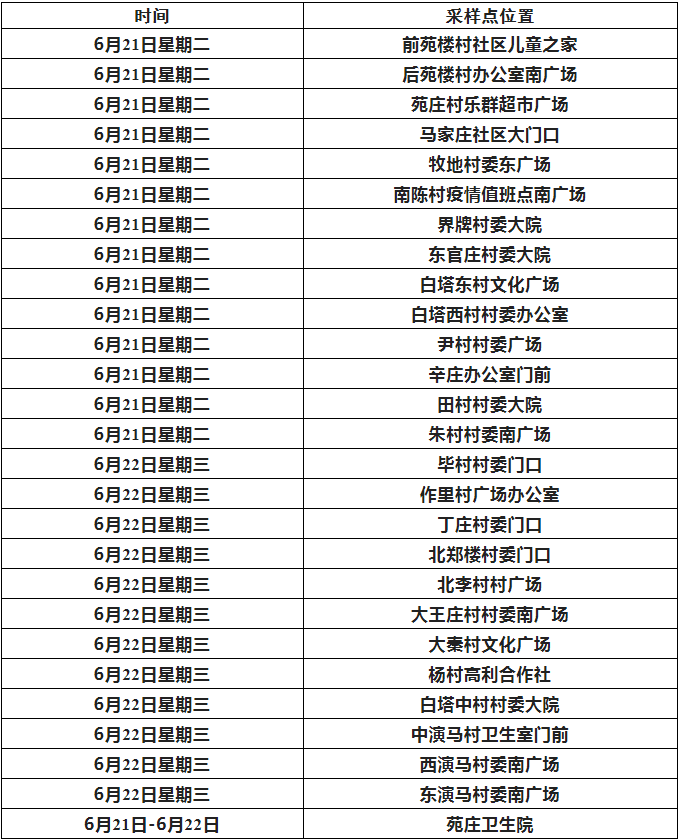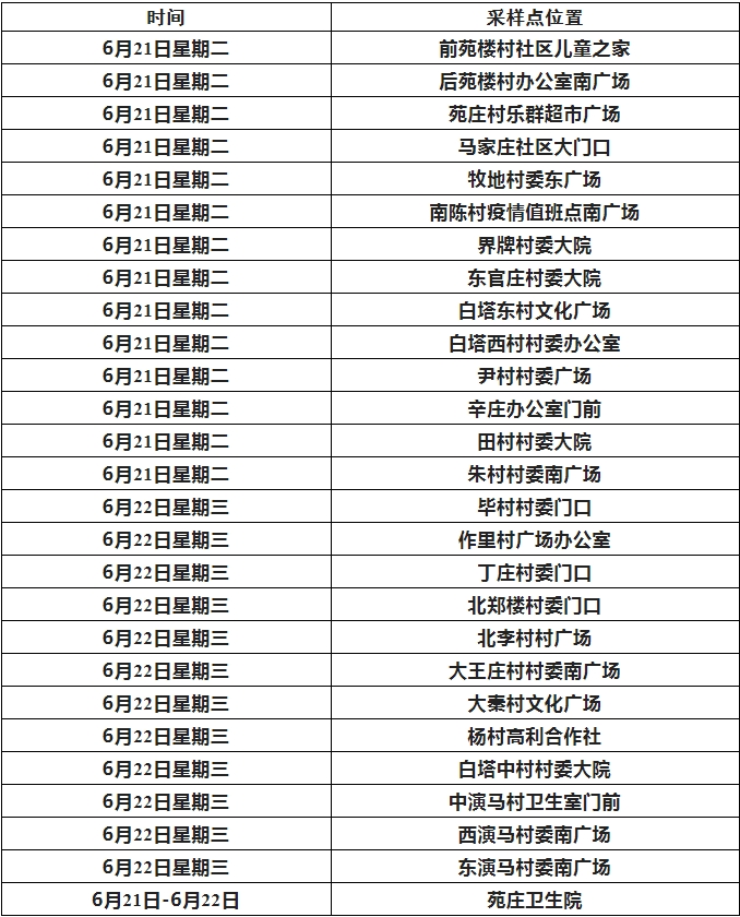 6月21日-6月22日(星期二、星期三),苑庄镇将开展第十三轮核酸检测,早上4点开始,两天时间内全部完成,苑庄镇共设置了27个采样点,做到不漏一户、不漏一人,检测时发放第十三轮检测贴,请所有居民携带身份证或者健康码务必就近参加检测。凡是没有本次核酸检测贴者,将不能进出村(小区)、单位、商超等公共场所!敬请大家广泛告知转发!
