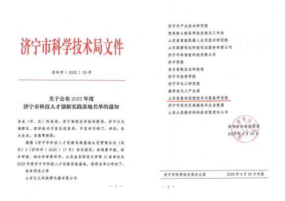 近日,市科技局公布了2022年度济宁市科技人才创新实践基地名单,我县省级新型研发机构——山东省复材成型技术与装备研究院成功入选济宁市科技人才创新实践基地。