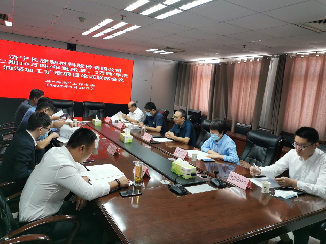 2022年9月28日,县“两高”工作专班召开专题联席会议。会议对济宁长胜新材料股份有限公司二期10万吨/年重质苯、2万吨/年洗油深加工扩建项目是否属于“两高”项目进行认定。