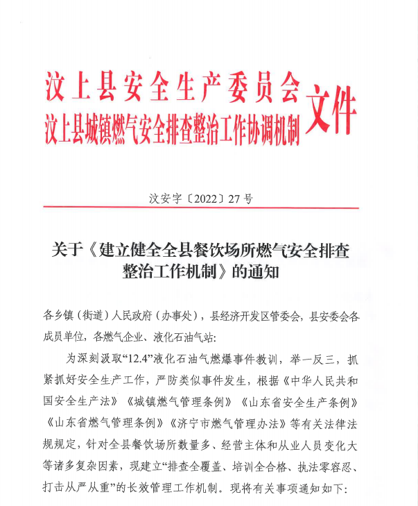 为全面做好全县城镇燃气领域安全生产工作,严格落实“排查全覆盖、培训全合格、执法零容忍、打击从严从重”的长效管理工作机制要求,2022年12月31日至2023年1月16日由县住建局、县商务局、县市场监管局、县应急管理局会同第三方专家检查机构组成联合检查工作组,对各乡镇、街道所有餐饮场所开展全覆盖、深层次燃气安全排查整治活动。
