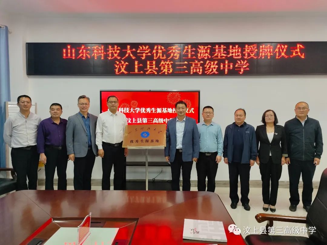10月27日,山东科技大学教务处处长、招生办公室主任樊建聪等一行赴汶上三中举行优秀生源基地揭牌仪式。汶上县教育和体育局党组书记、局长崔兆刚,汶上三中党委书记寻尚文、校长郝宏等出席活动。揭牌仪式由郝宏主持。