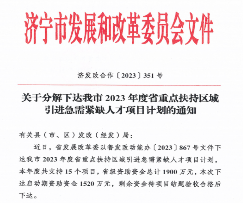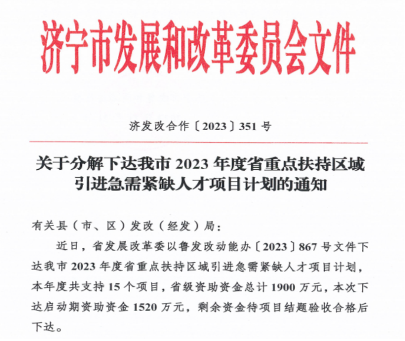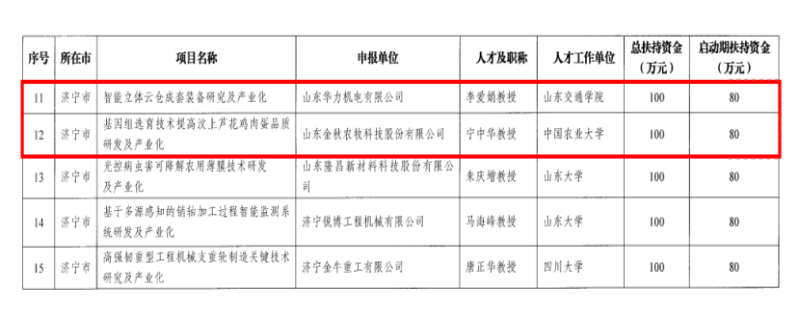 近日,市发改委下达了《关于分解下达我市2023年度省重点扶持区域引进急需紧缺人才项目计划的通知》,我县山东华力机电有限公司智能立体云仓成套装备研究及产业化项目和山东金秋农牧科技股份有限公司基因组选育技术提高汶上芦花鸡肉蛋品质研发及产业化项目成功申报2023年度省重点扶持区域引进急需紧缺人才项目,分别获得资助经费100万元,共计200万元,项目个数居全市第一。