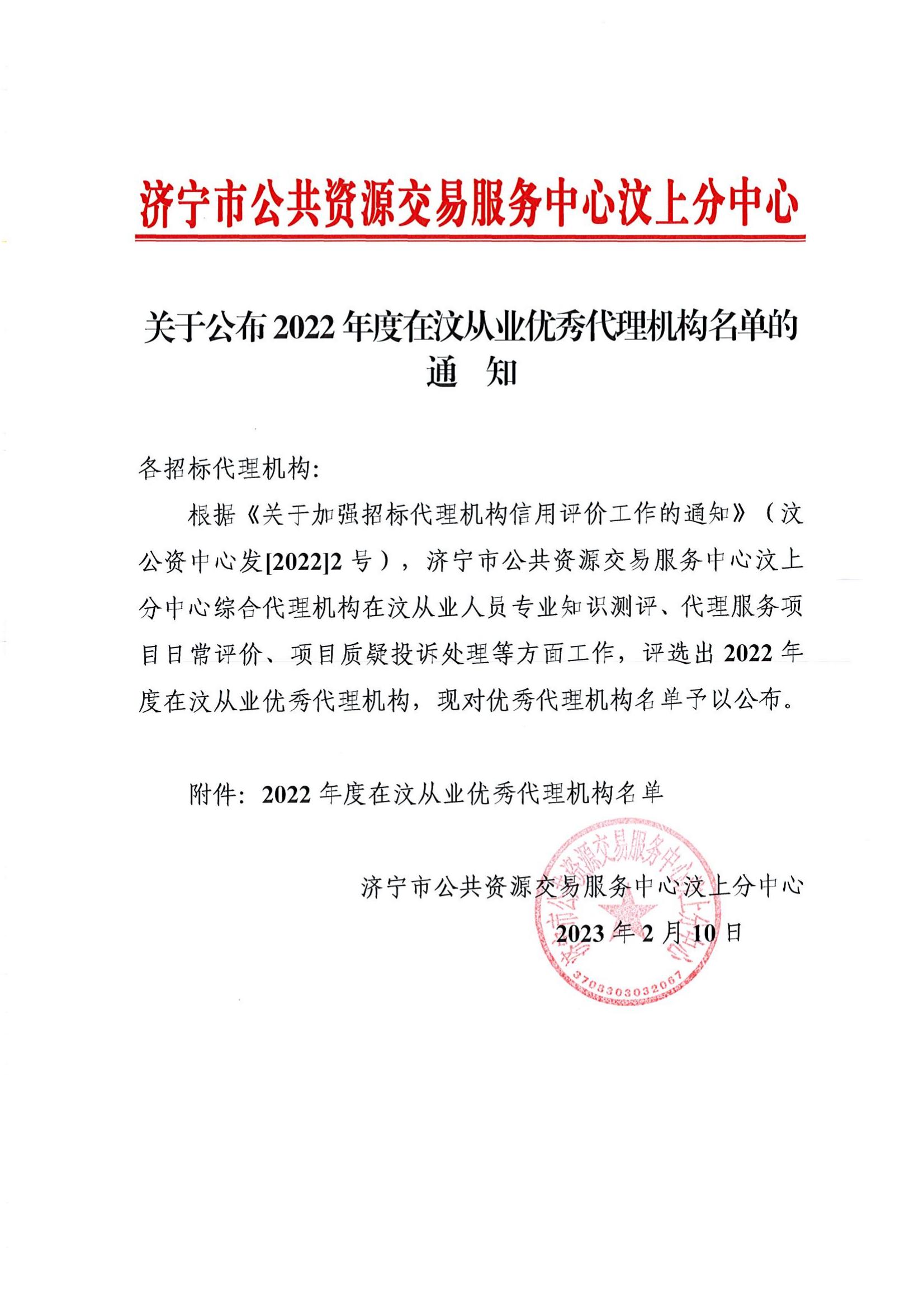 关于公布2022年度在汶从业优秀代理机构名单的通知