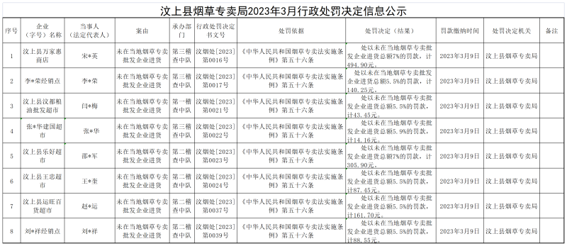 汶上县烟草专卖局2023年3月行政处罚决定信息公示