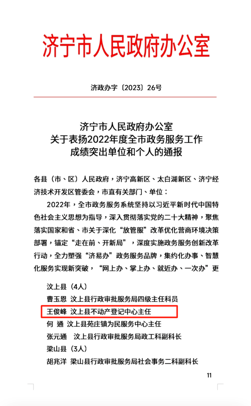 喜报 |汶上县自然资源和规划局王俊峰同志荣获2022年度全市政务服务工作成绩突出个人