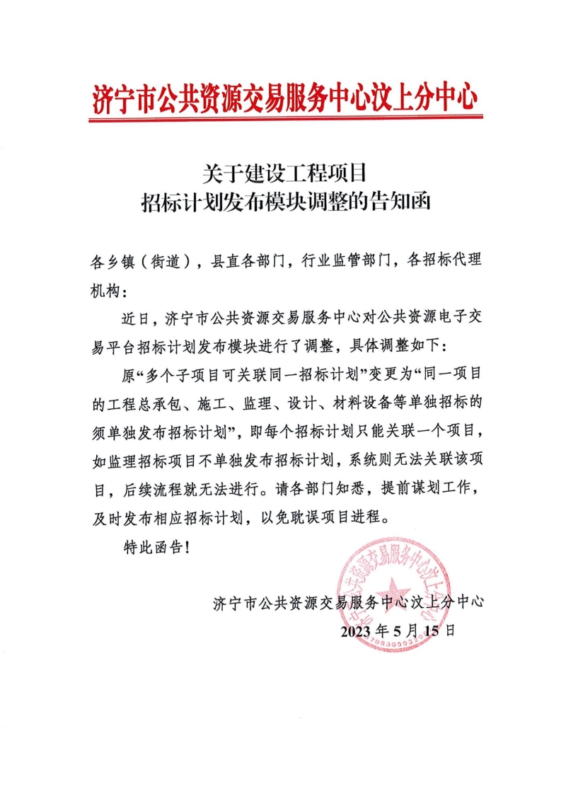 关于建设工程项目招标计划发布模块调整的告知函